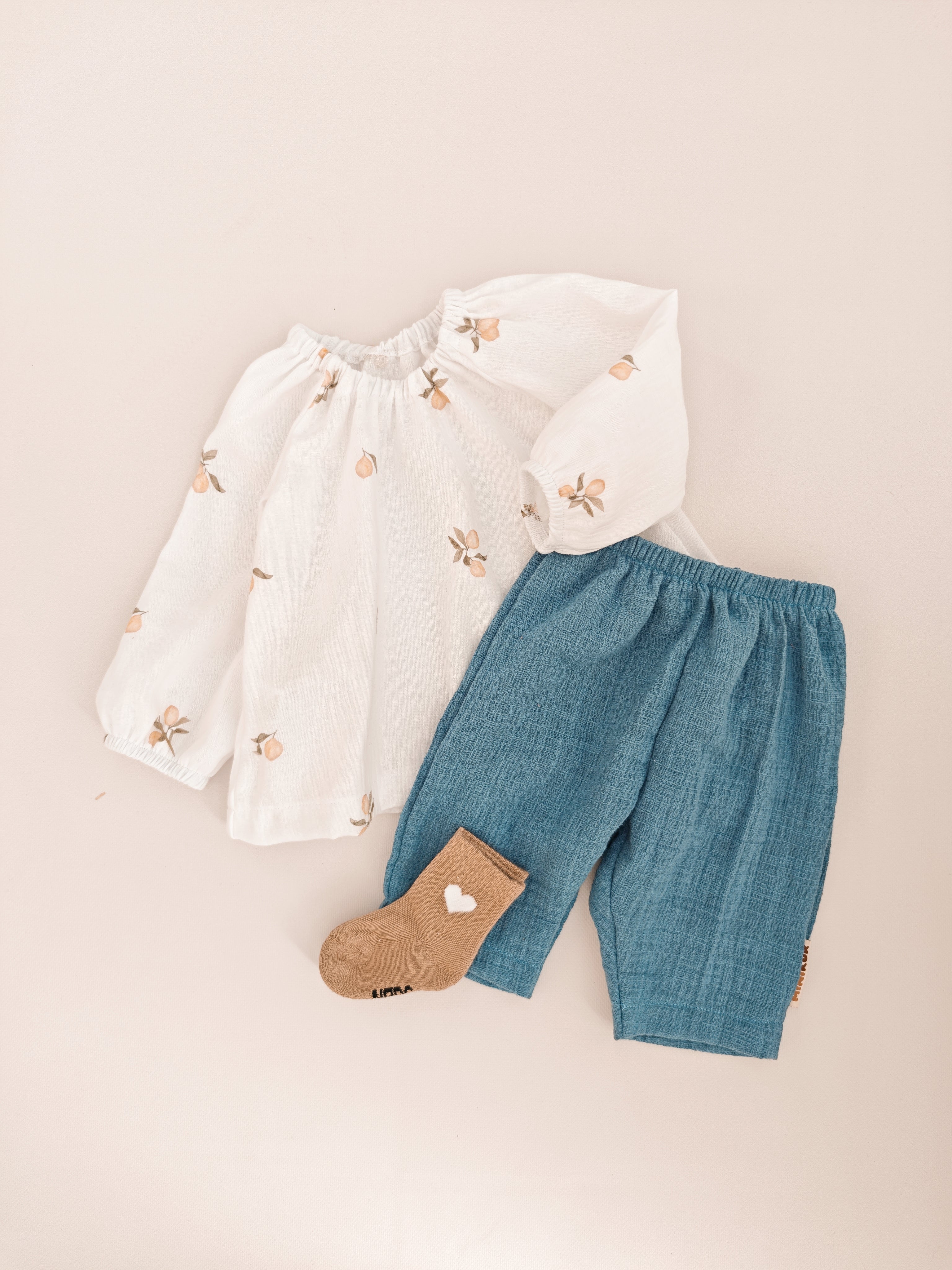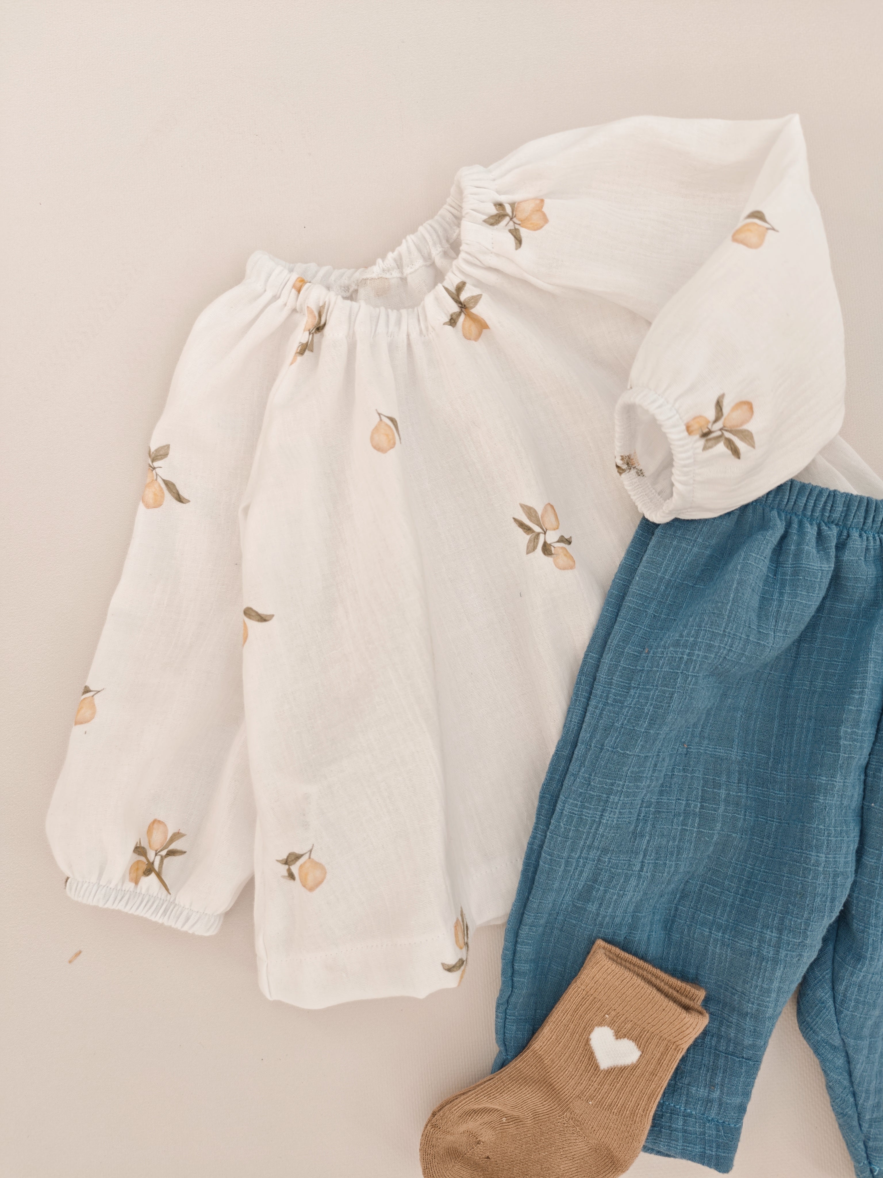 Unsere Musselinbluse für Kinder ist das absolute Highlight für warme Tage und festliche Anlässe. In einem strahlenden Off-White gehalten und mit einem exklusiven Zitronen-Print verziert, versprüht sie pure Lebensfreude. Dieses Design wurde speziell für Minikor entworfen und ist nur bei uns erhältlich.