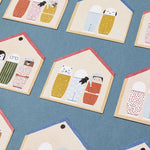 Die Familien (Zuordnung): Nutze die hausförmigen Karten! Das Ziel ist es, alle Mitglieder einer Familie in einem einzigen Zug zu finden und in ihr gemeinsames Haus zu bringen.
