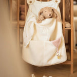 Wenn du dieses niedliche Schmusetuch mit Teddybären am Schnuller befestigst, geht er nie wieder verloren! Damit gehört die Schnullersuche im Laufgitter, Bett oder im Kinderwagen der Vergangenheit an. Nie mehr nächtliche Eskapaden mit eingeschaltetem Licht, sodass dein Baby und du hellwach sind und nach dem kleinen Schnuller suchen. Mit dem Schmusetuch holst du den Schnuller mit einem Griff aus der Ecke der Wiege und dein Baby kann sofort wieder einschlafen. Und die Teddybärform macht es zu einem besonders lustigen Spielzeug. Mit der Lasche bindest du das Schmusetuch einfach am Schnuller fest.