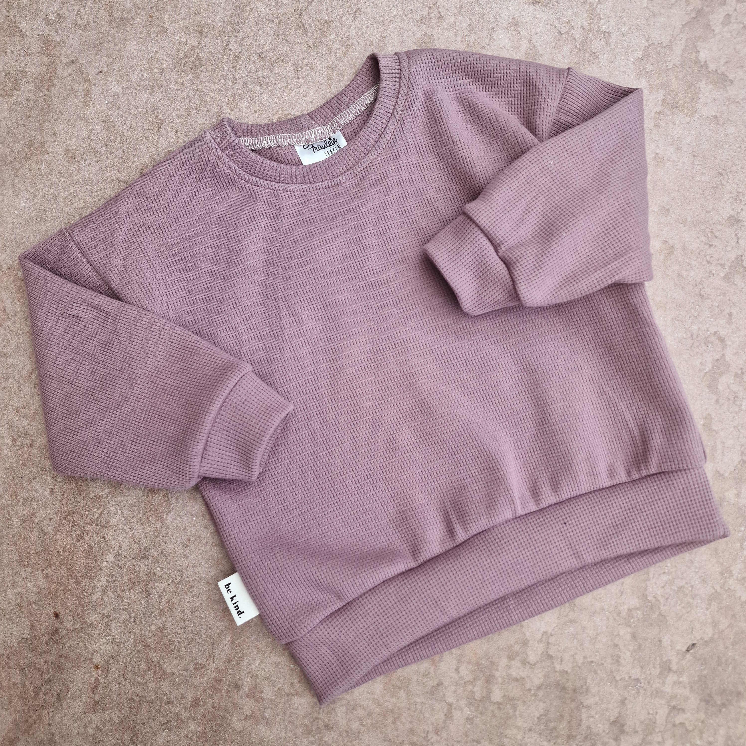 Traumhaft weicher Pullover aus dem tollen Waffeljersey mit kleinem Label. Er sitzt Oversize und bietet Platz für Tshirts darunter. Dazu eine Leggins, Sparkebukse oder Pumphose und fertig ist das Outfit.