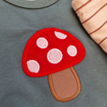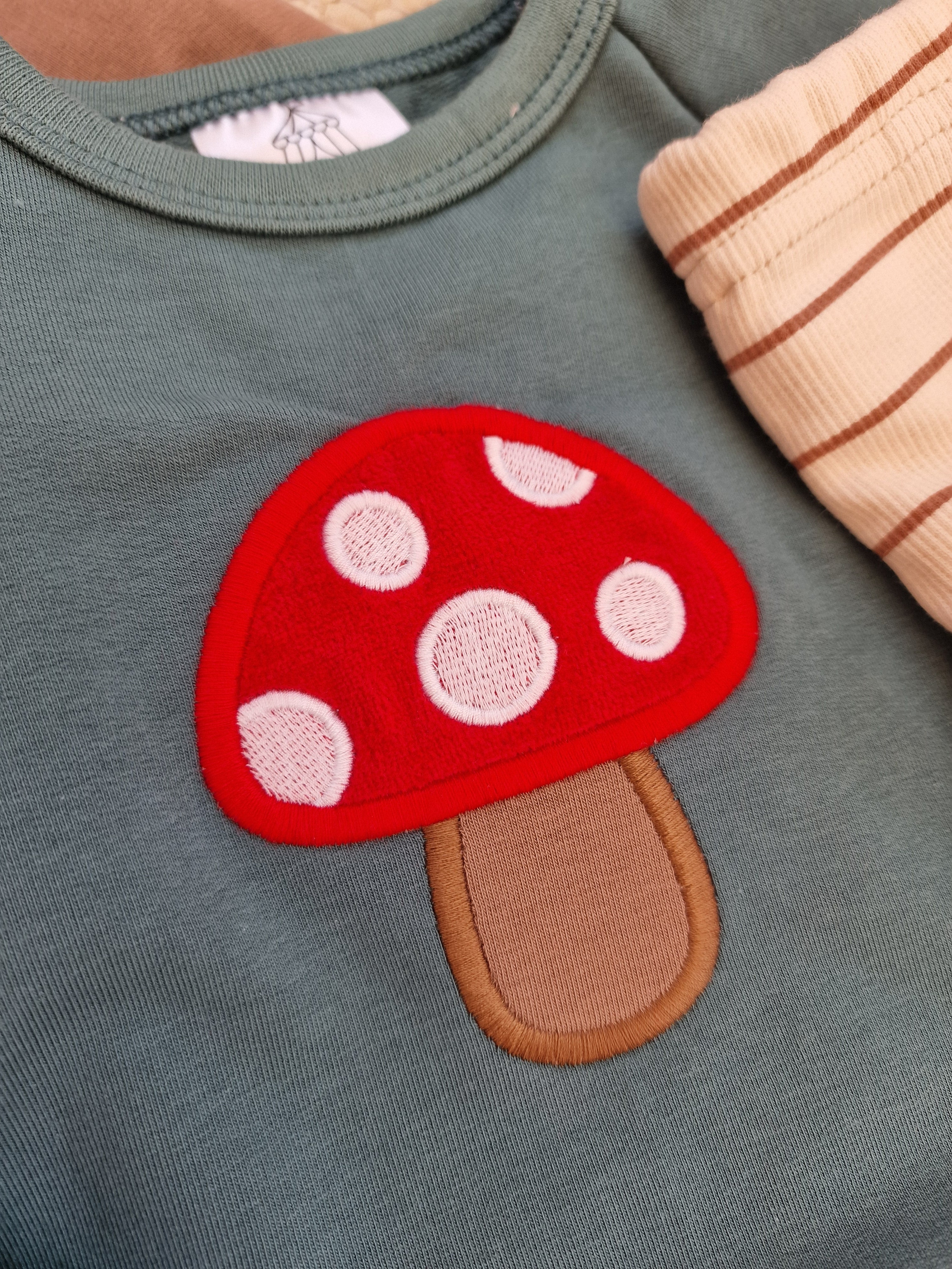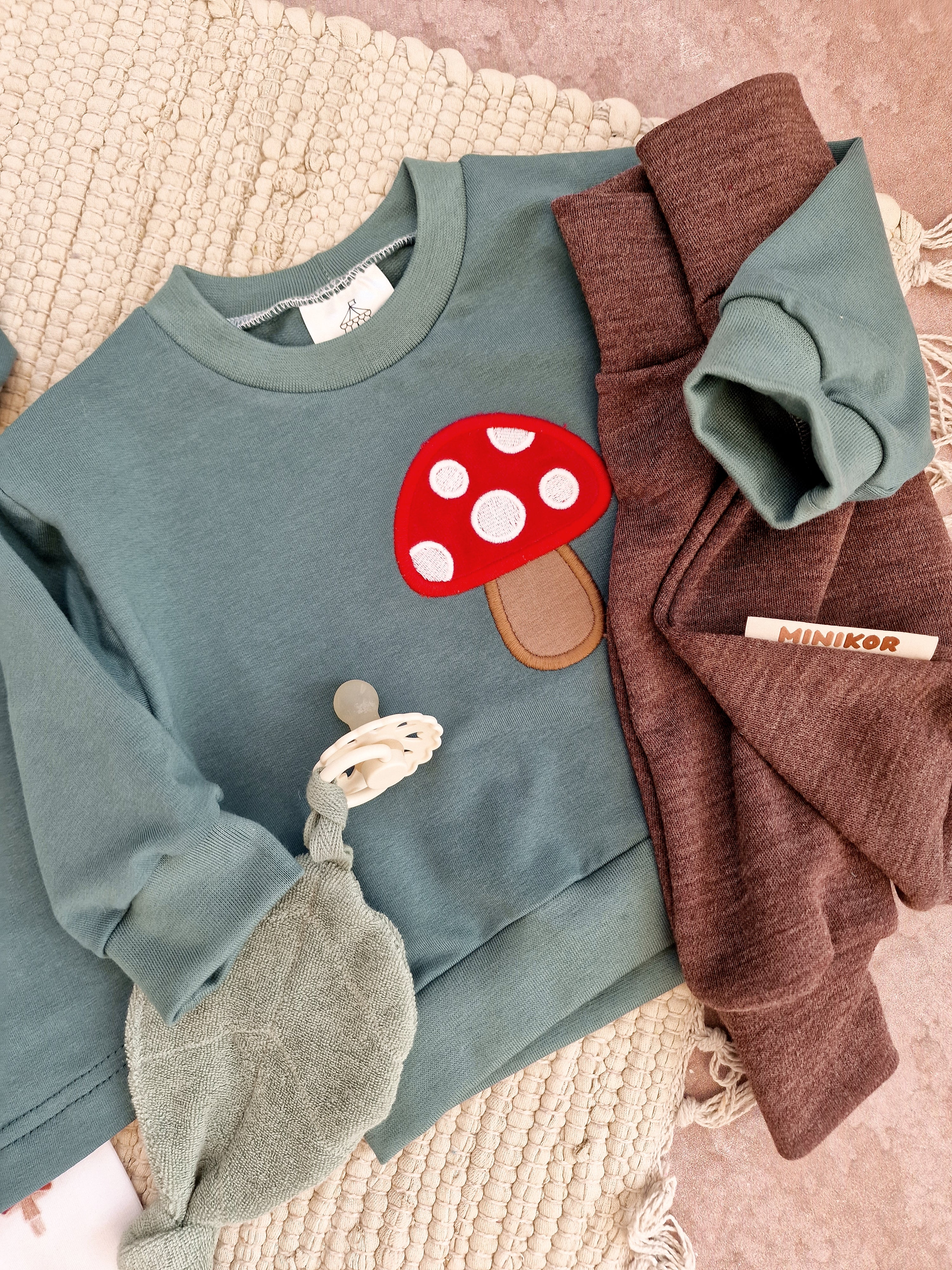 Traumhaft weicher Pullover aus Sweater mit gestickter Fliegenpilz Applikation. Er sitzt Oversize und bietet Platz für Tshirts darunter. Dazu eine Leggins, Sparkebukse oder Pumphose und fertig ist das Outfit.