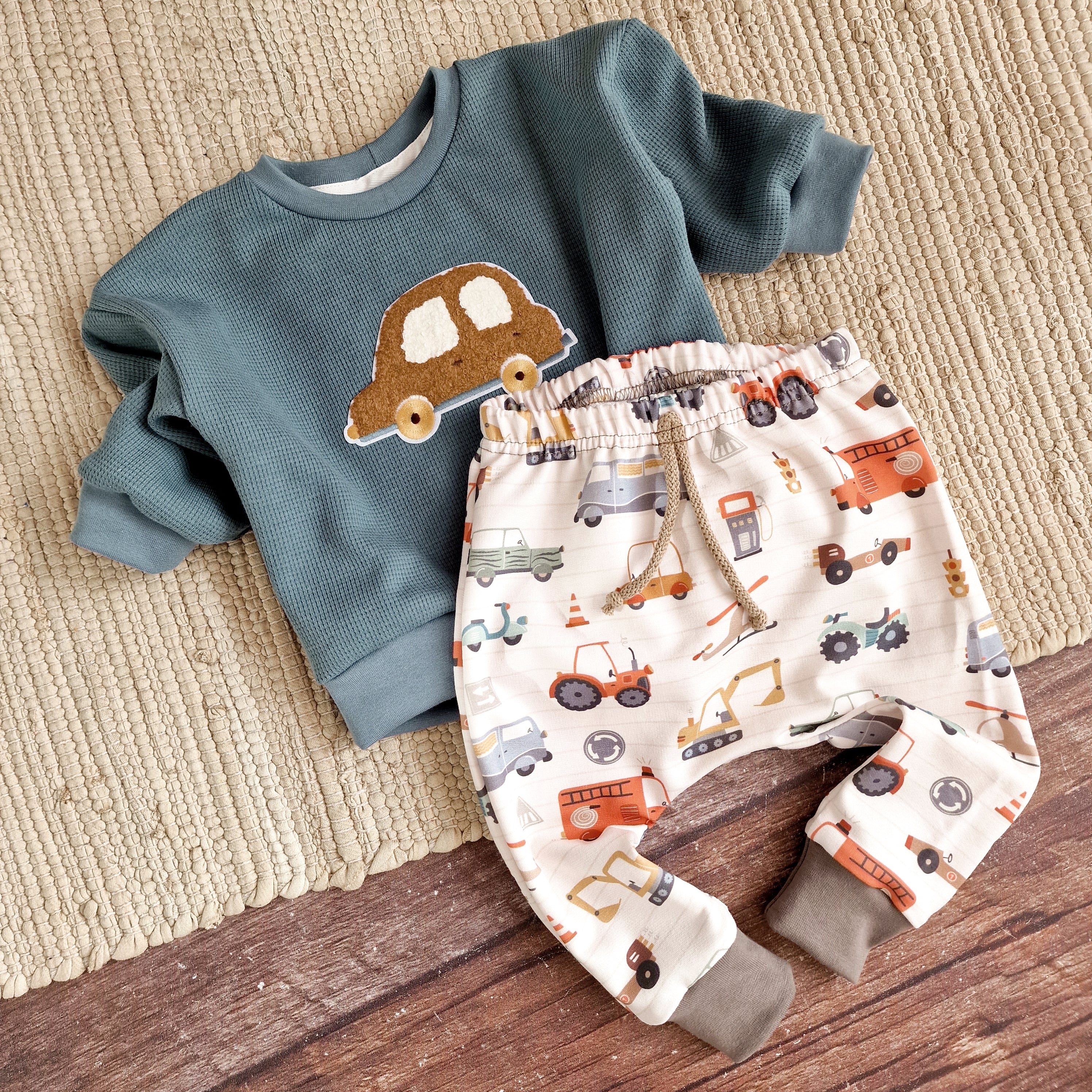 Traumhaft weicher Pullover aus Waffeljersey in Jeansblau. Er sitzt Oversize und bietet Platz für Tshirts darunter. Dazu eine Leggins, Sparkebukse oder Pumphose und fertig ist das Outfit.