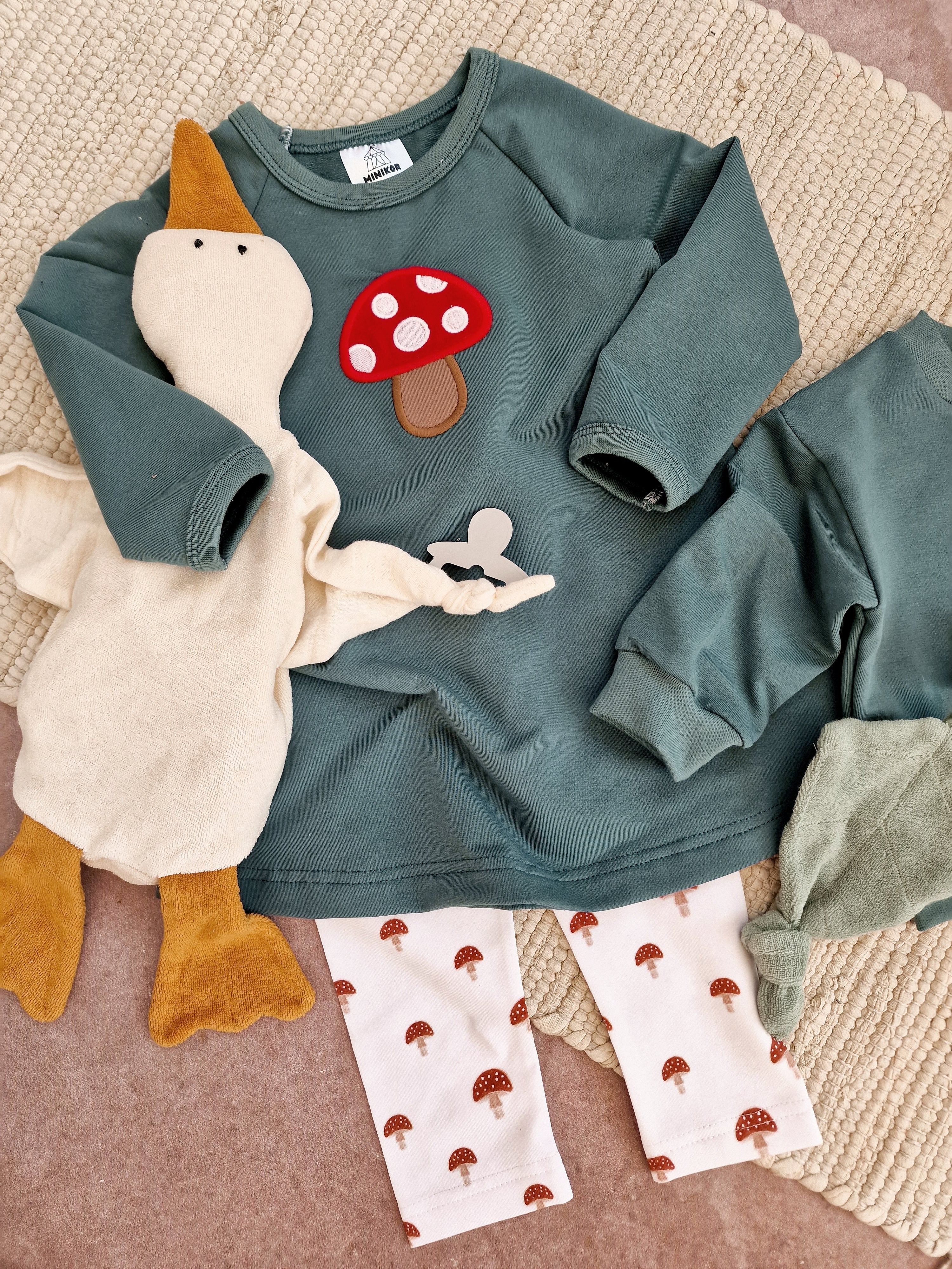 Dieses schöne Raglankleid mit gestickter Applikation ist ein richtiges Highlight. Passend mit einer Leggings und Baumwollfleecejacke ist es ein sehr niedliches Herbstoutfit. Es fällt leicht größer aus und passt sehr lange.