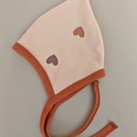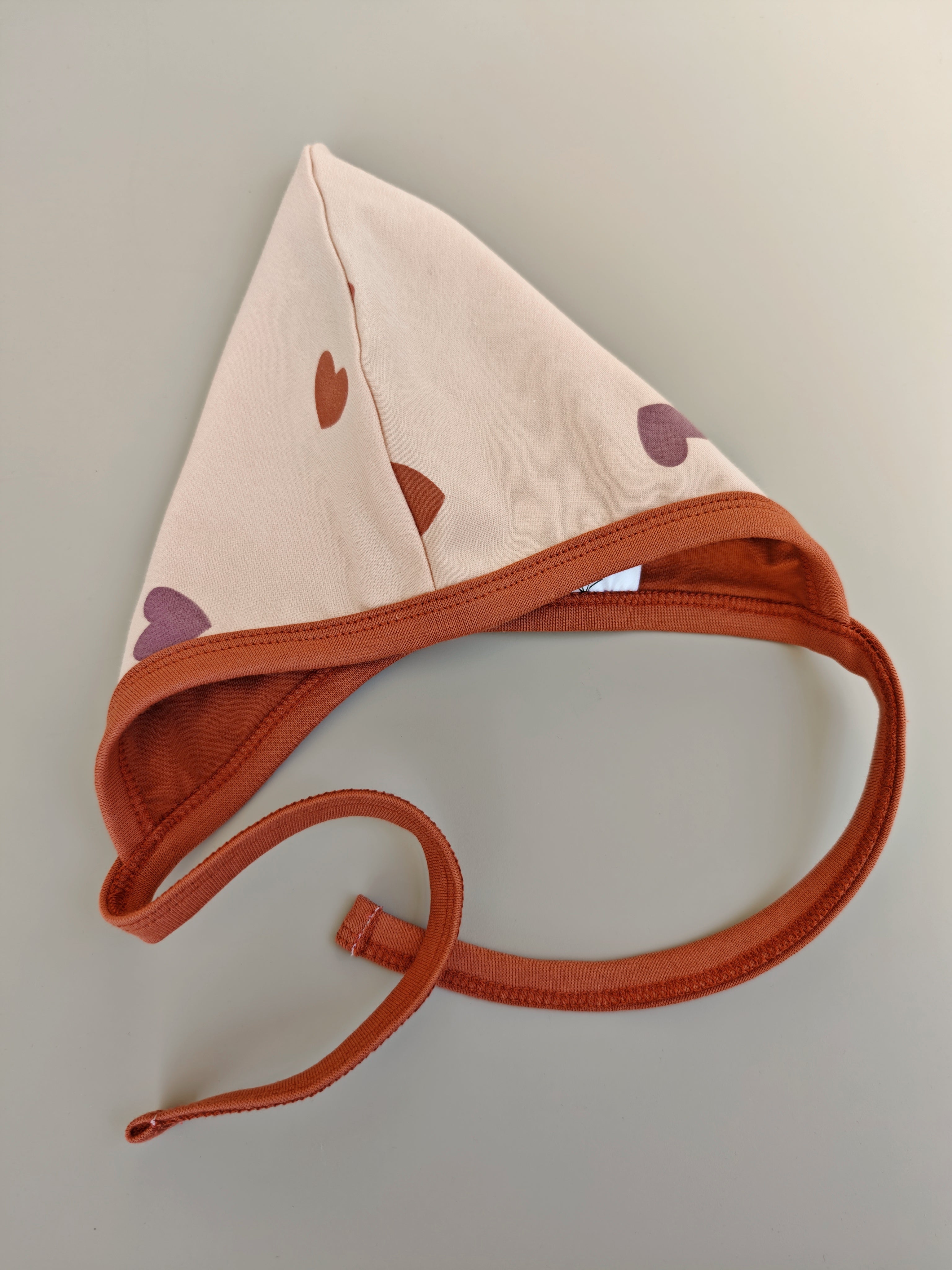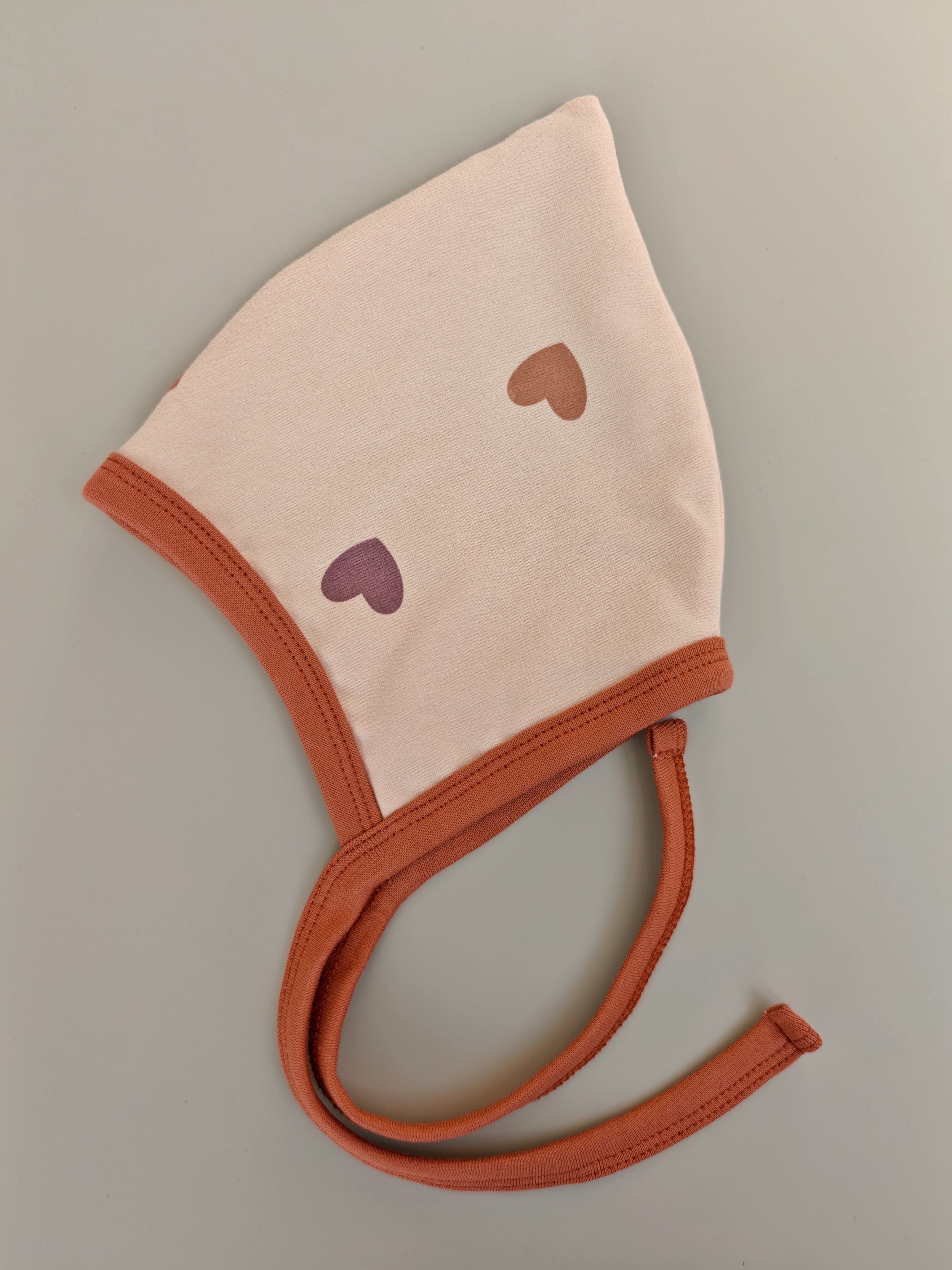 Diese Spidslue ist aus Jersey mit Herzchen, gefüttert mit Baumwollejersey in Ziegelrot