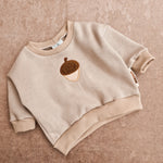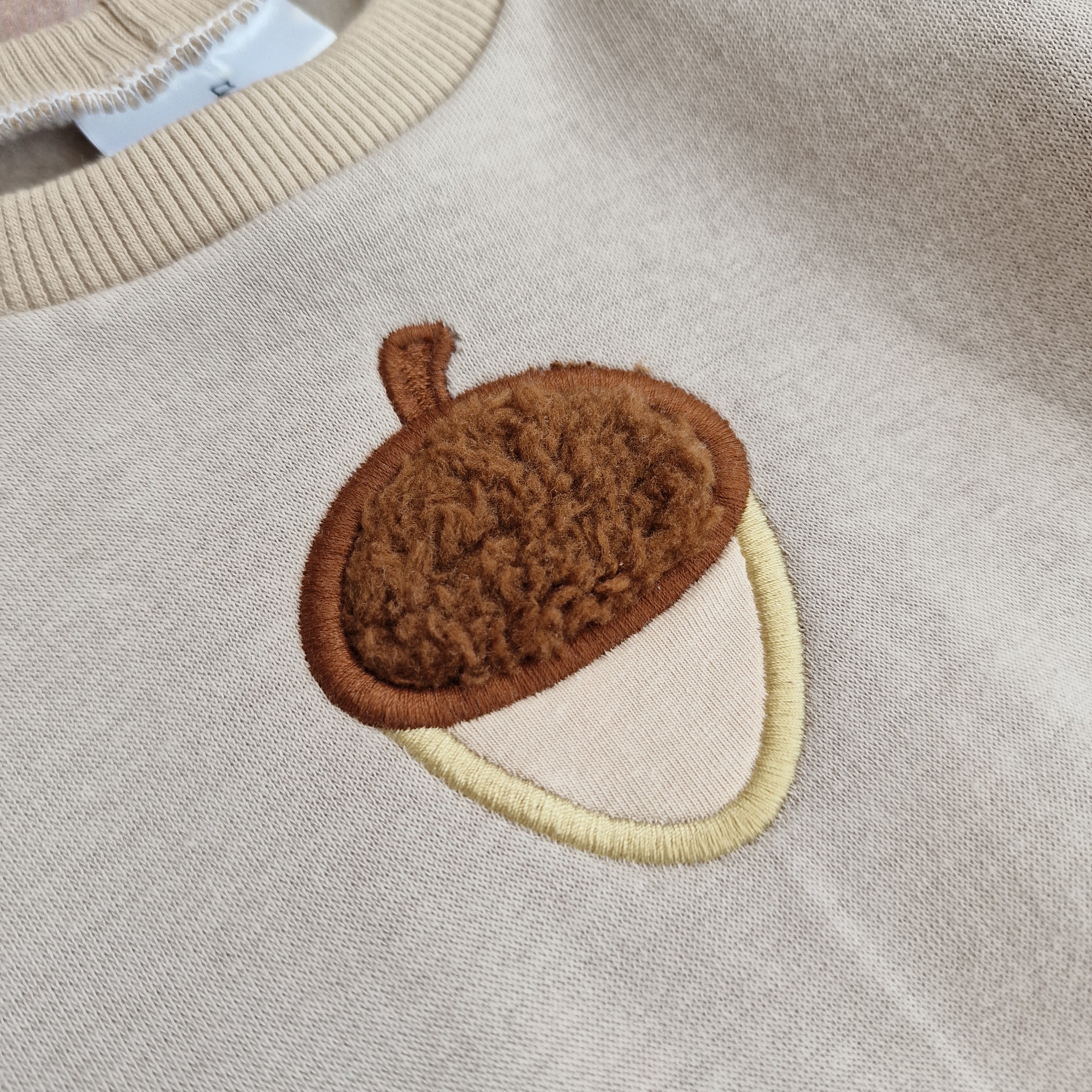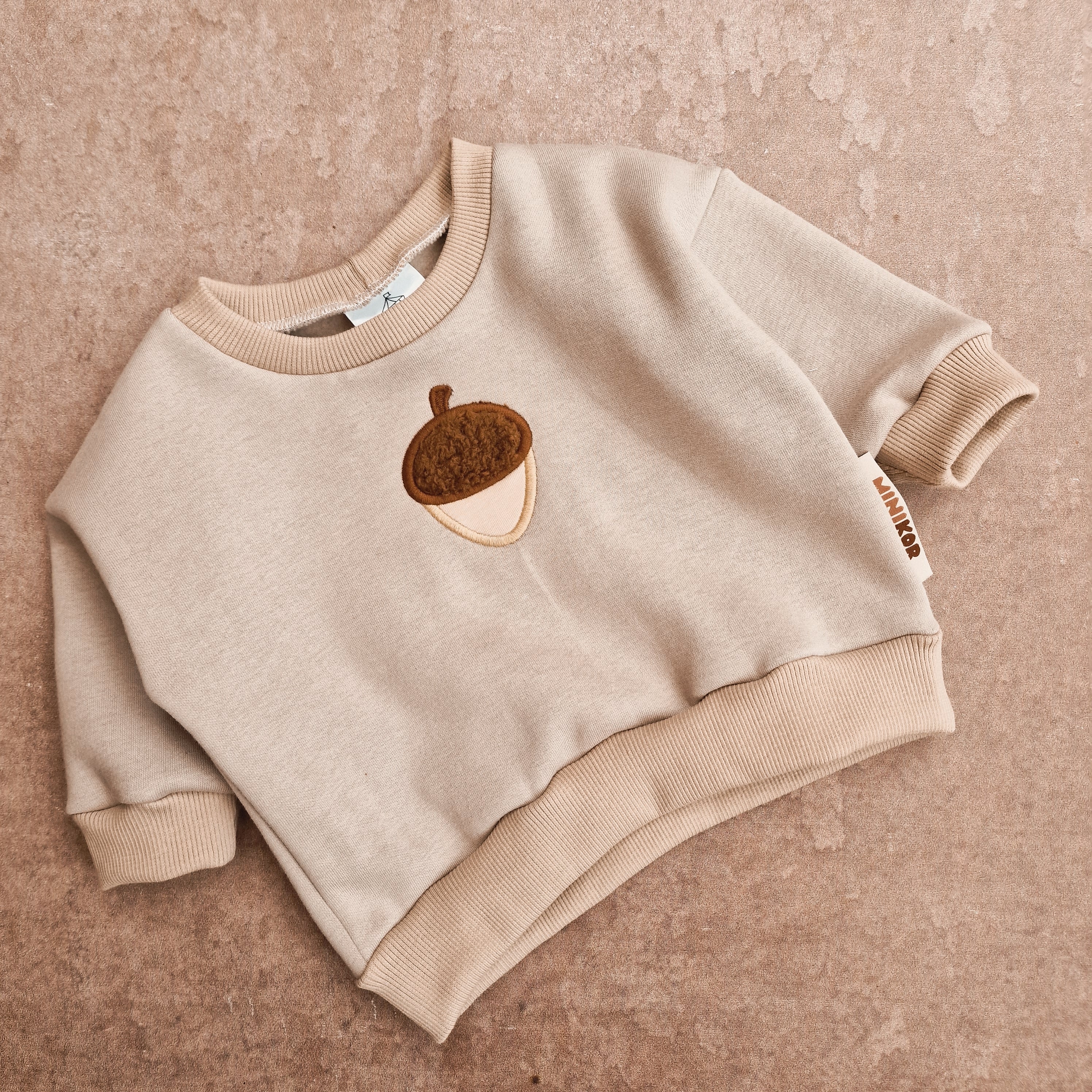 Traumhaft weicher Pullover aus Sweat mit gestickter Eichel Applikation. Er sitzt Oversize und bietet Platz für Tshirts darunter. Dazu eine Leggins, Sparkebukse oder Pumphose und fertig ist das Outfit.