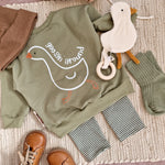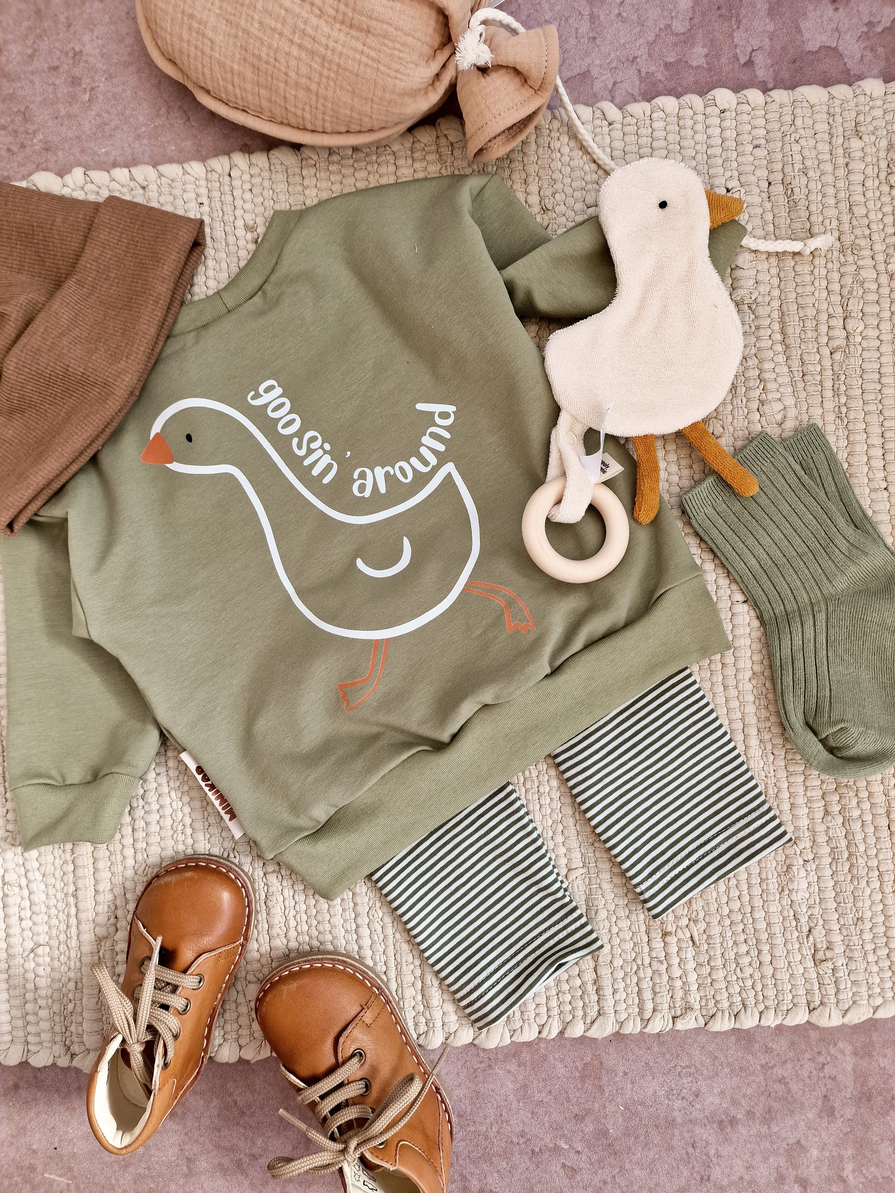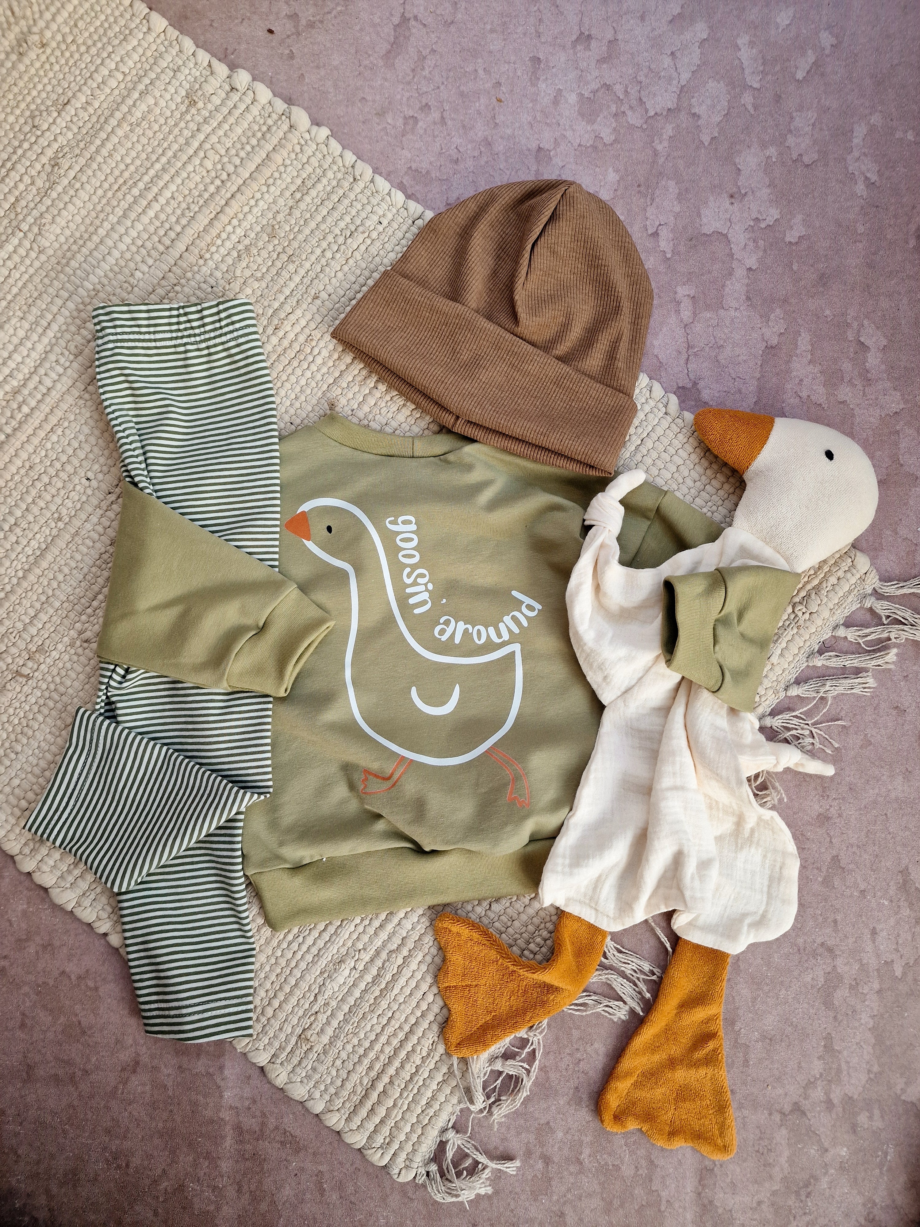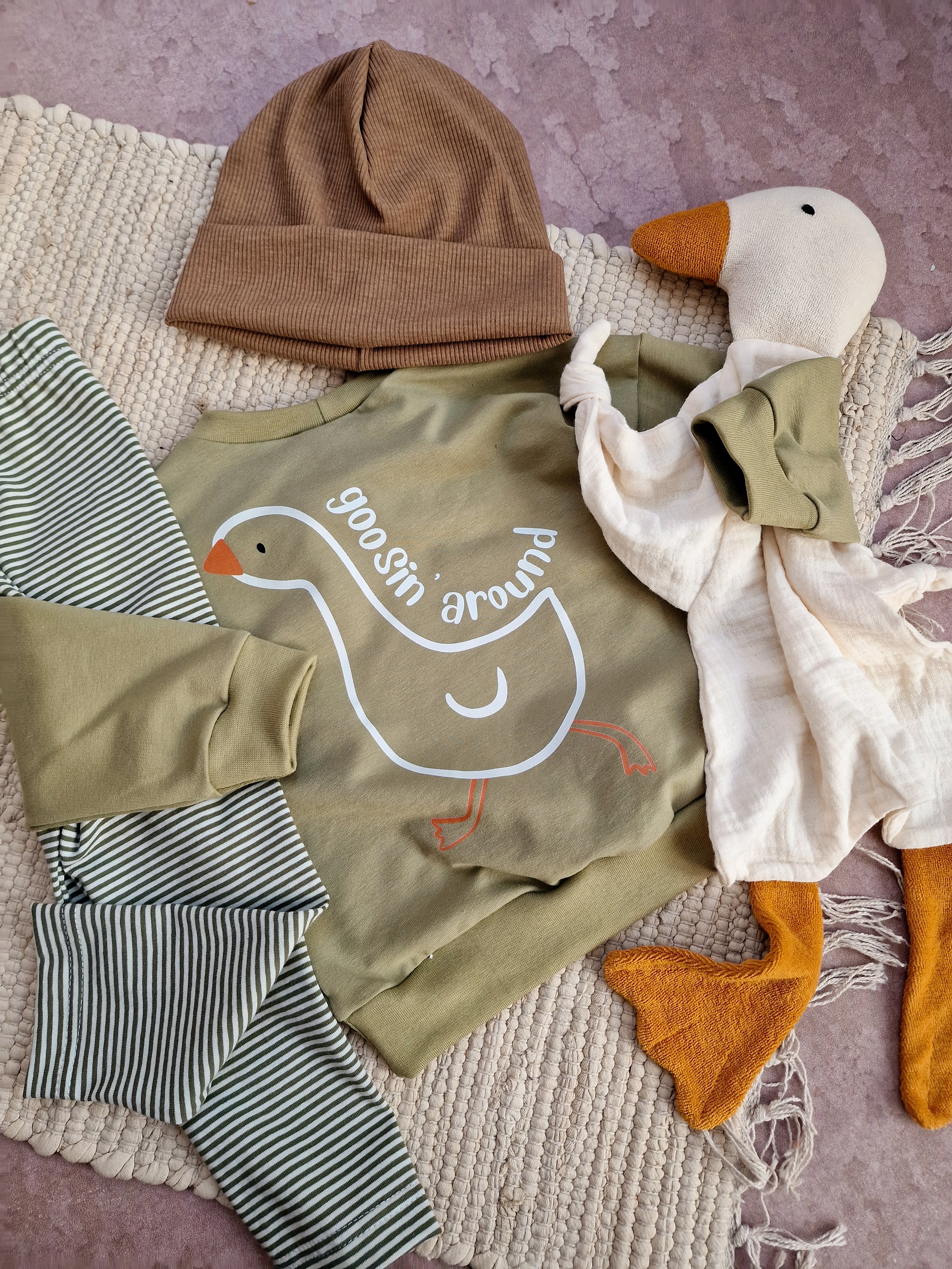 Traumhaft weicher Pullover aus French Terry mit Gänseprint. Er sitzt Oversize und bietet Platz für Tshirts darunter. Dazu eine Leggins, Sparkebukse oder Pumphose und fertig ist das Outfit.
