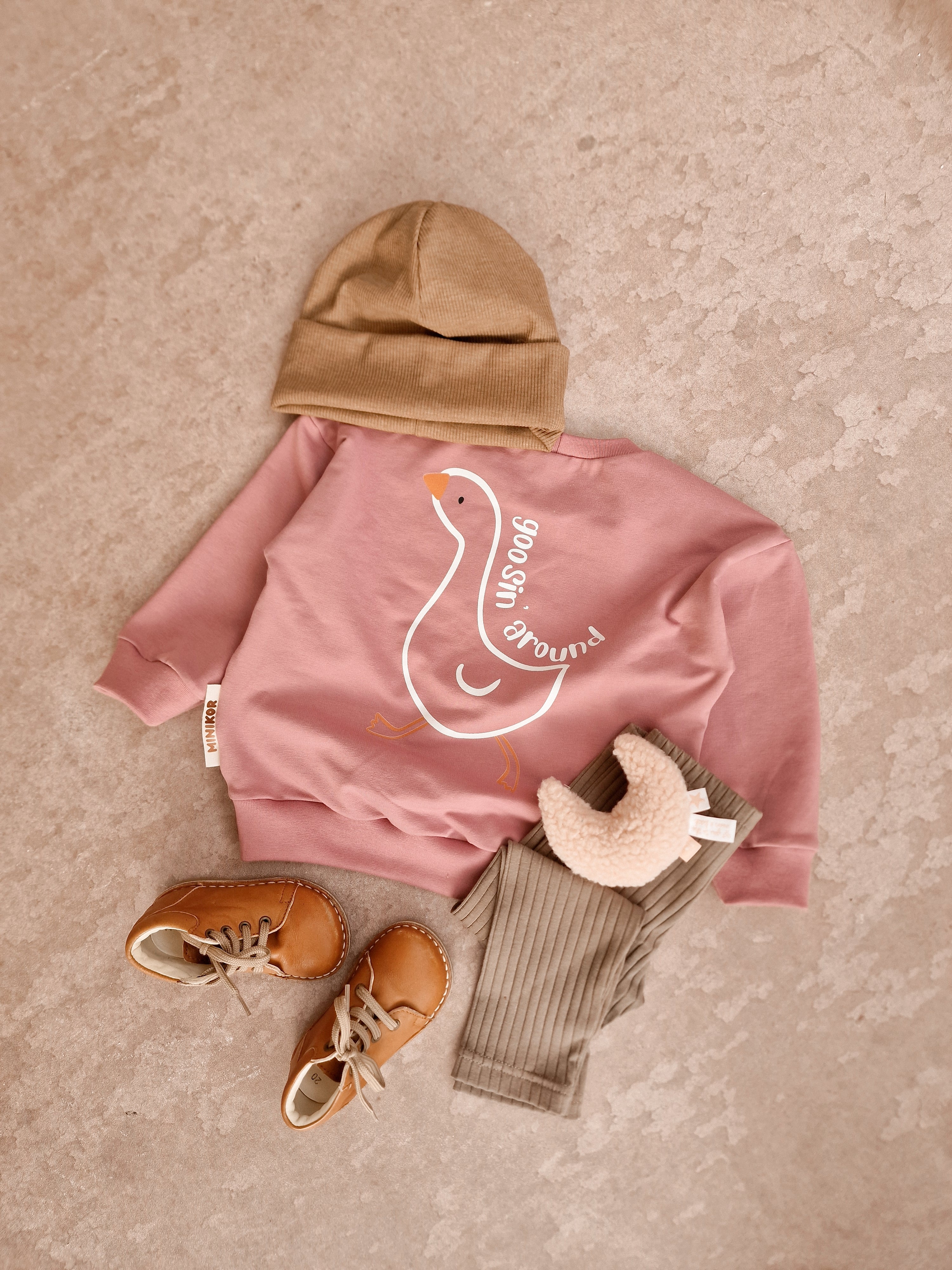 Traumhaft weicher Pullover aus French Terry mit Gänseprint. Er sitzt Oversize und bietet Platz für Tshirts darunter. Dazu eine Leggins, Sparkebukse oder Pumphose und fertig ist das Outfit.