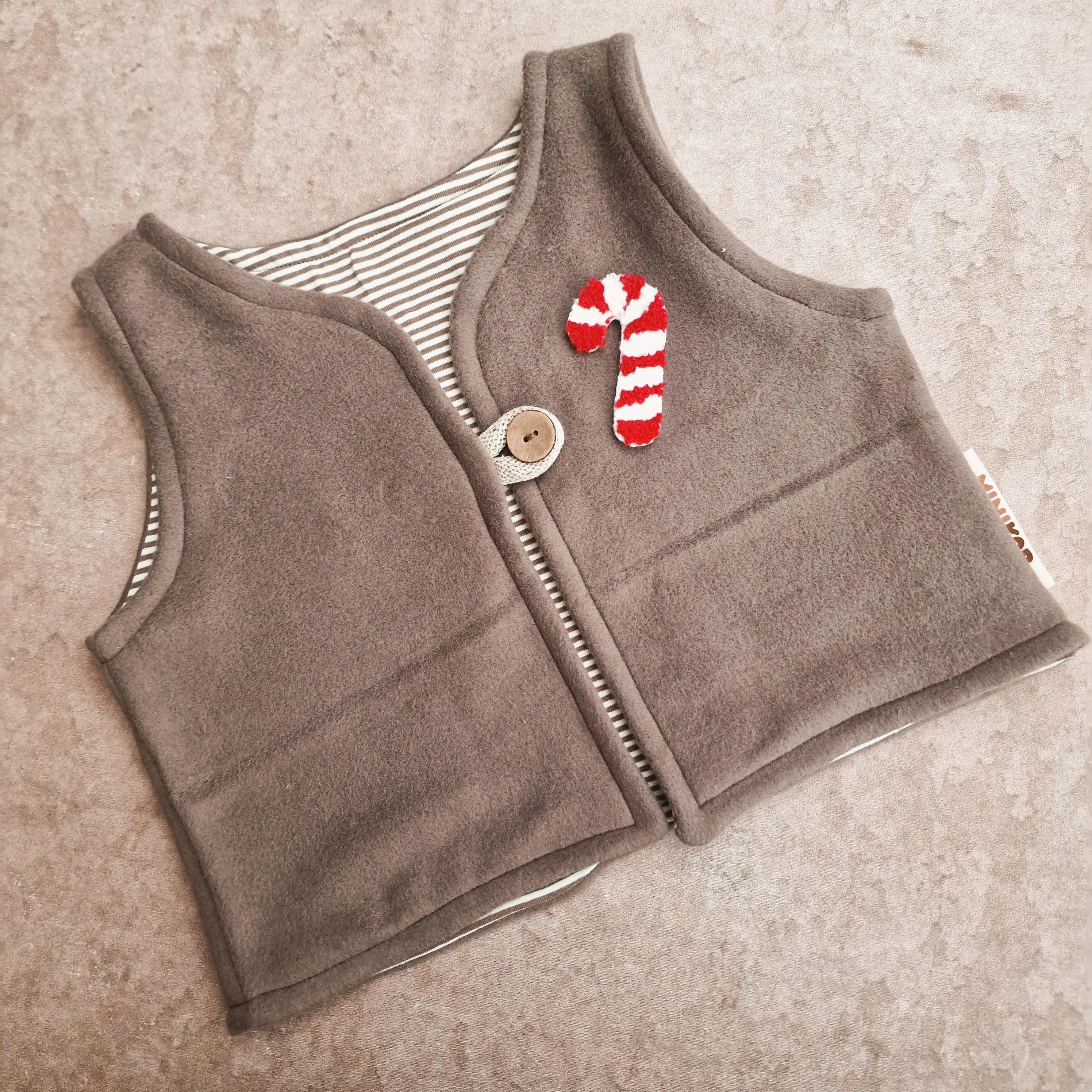 Niedliche Weste aus 100% Baumwolle. Der weiche Fleece ist gefüttert mit Baumwolljersey. Zu verschließen ist sie mit einem Kokosknöpfen. Auf der Seite befindet sich ein kleines Chenillepatch